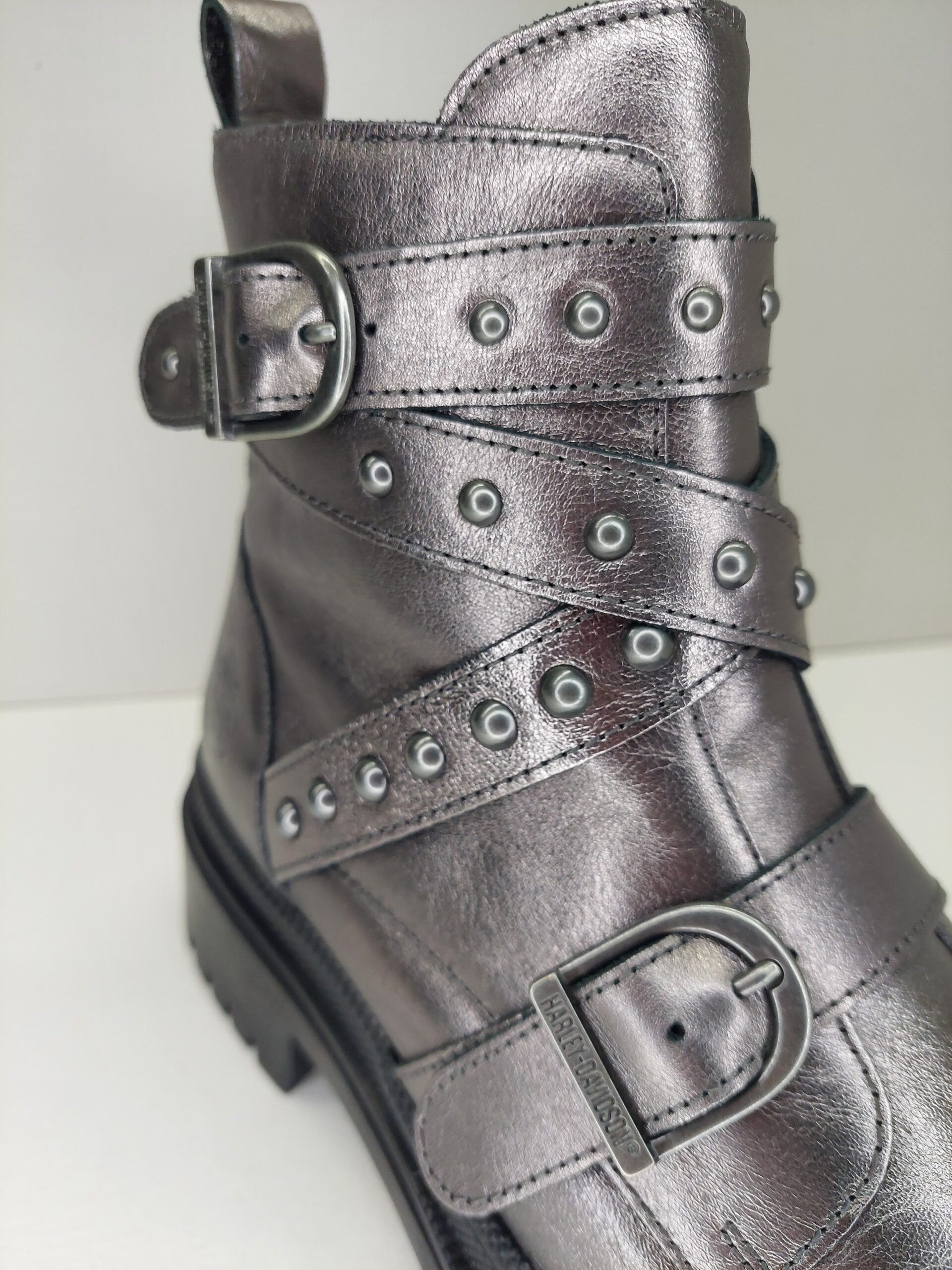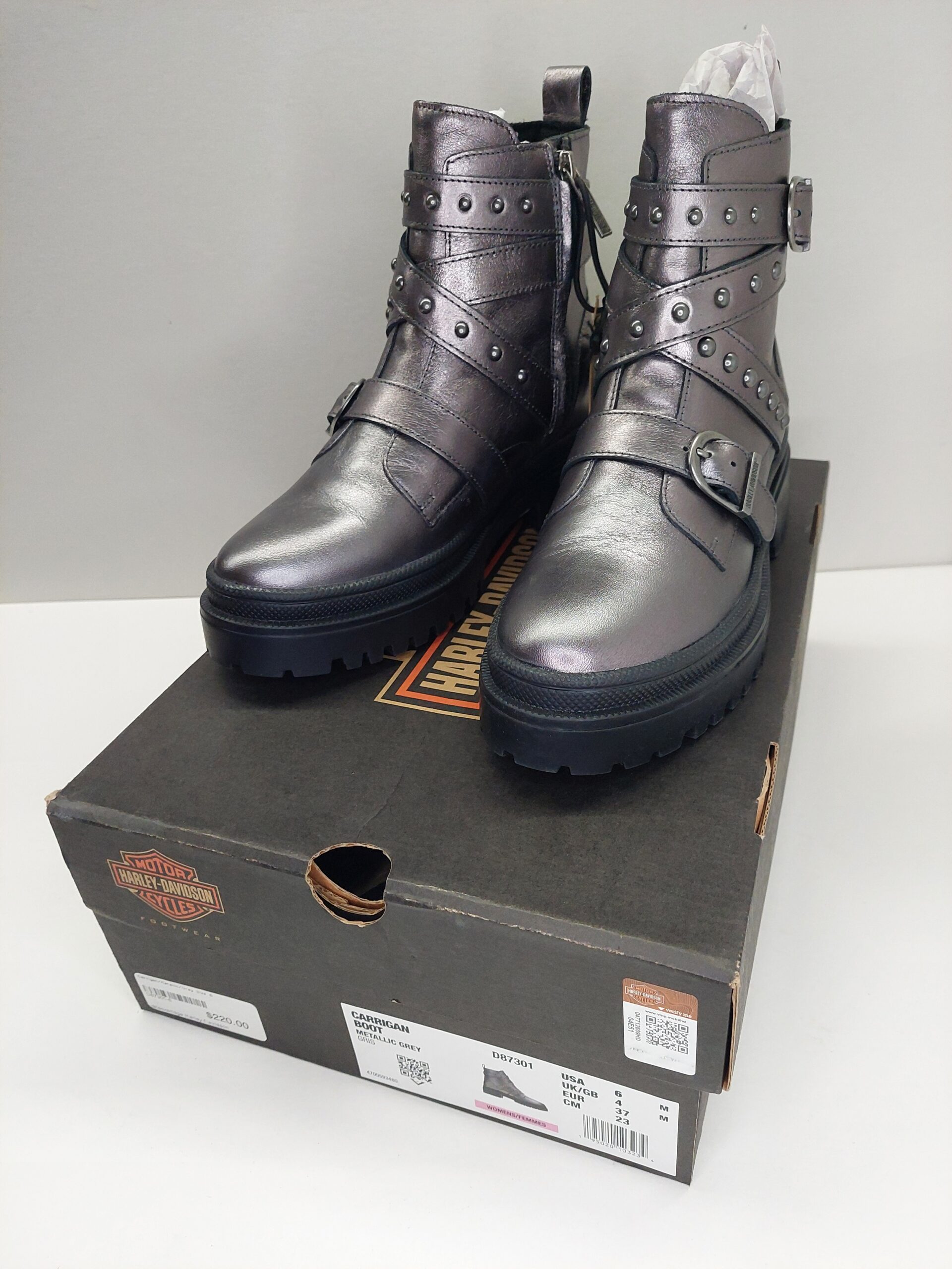 Add these boots to your fashionable footwear collection for a sassy moto look with metallic and stud details. Arriving at any destination, heads will turn: Biker Lady Arriving. The H-D® Carrigan boot is designed with full-grain leather with a metallic grey finish.